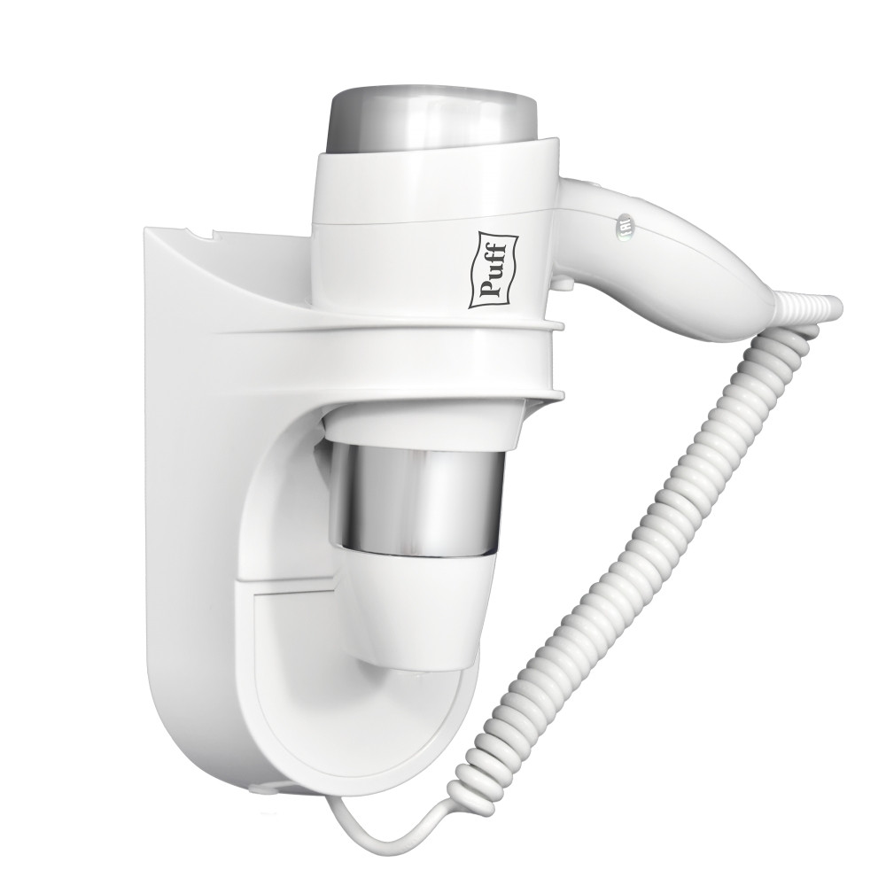Фен для волос Puff-1600 предназначен для стационарного монтажа в туалетных и ванных комнатах. Включение кнопкой на ручке. 2 температурных режима работы.